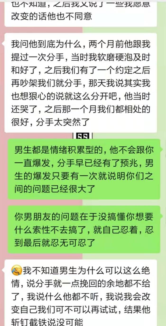 之前也有过闹分手的经历,本来冷战的这段时间姑娘没觉得有什么,用她的话说"我本来以为这一辈子他是不会离开我的,除非我死了",直到冷战了半个月姑娘主动给男生发信息想和好,男生坚决拒绝,她才开始慌了。