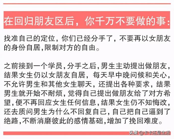 上面提到你们刚分手的时候可以进行两次道歉和挽回,但是我要很负责任的告诉你,你现在的道歉和挽回都是没用的,因为此时的他对你已经产生了否定心理,你说什么做什么他都不会相信,不会对你改观,但是你的不纠缠会让对方对你放下戒备心,这个时候你提出继续做朋友,对方是不会排斥的。