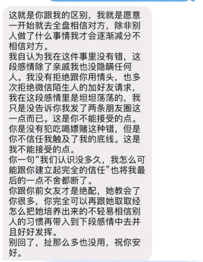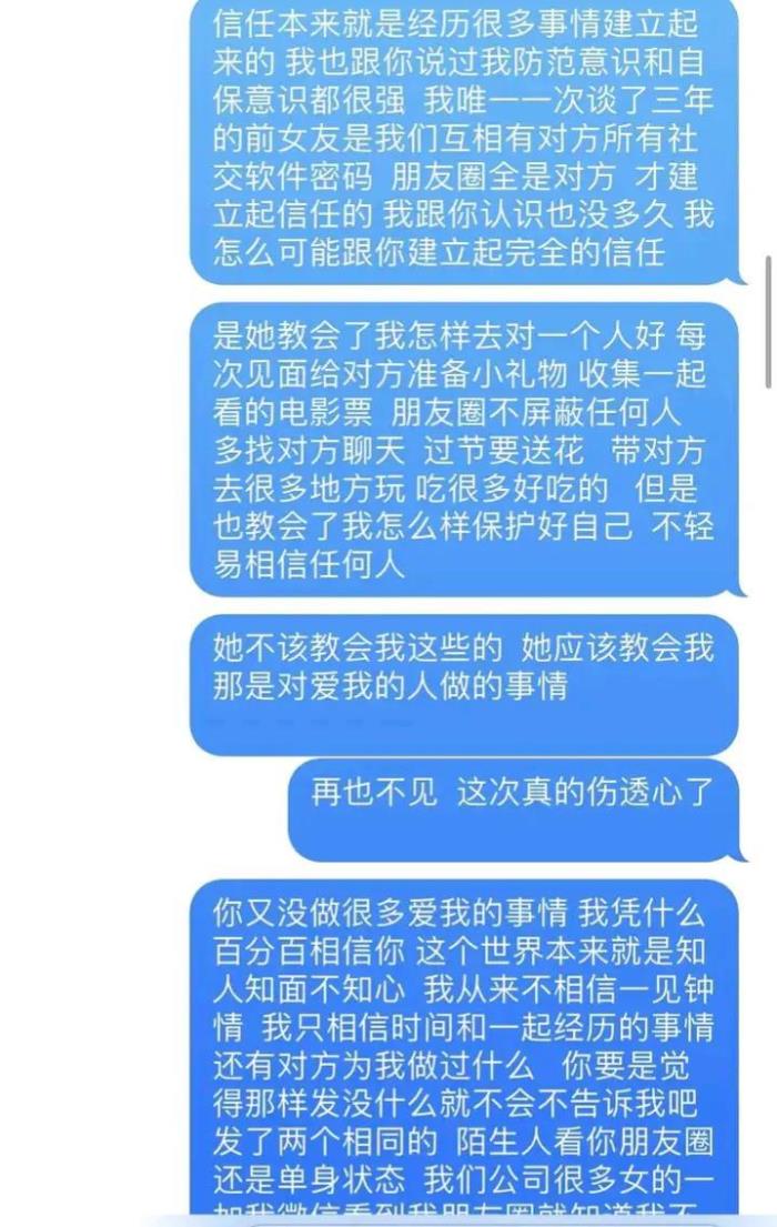 可是呢,她说我这样做,让她没了安全感,她就抓着这一点说我不信任她,试探她,说我不行,铁了心的要跟我分手。