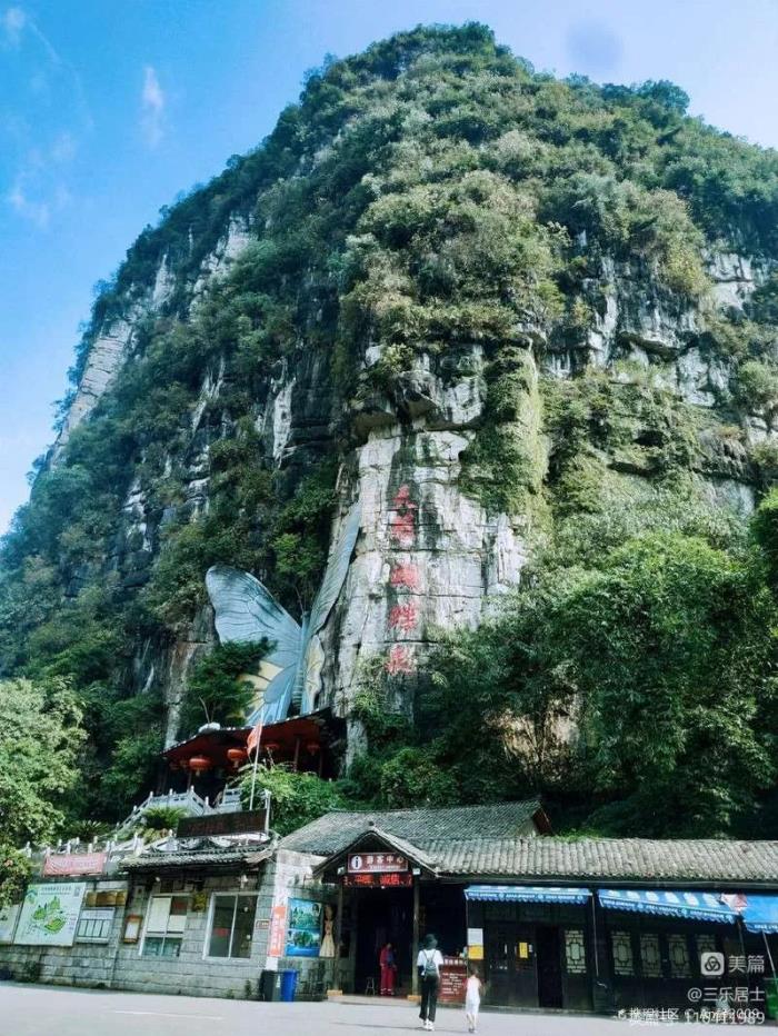 接着来到了一座峻峭的山峰下,绝壁上有一只巨大的、五彩斑斓、展翅欲飞的“蝴蝶”,这就是天籁•蝴蝶谷景区。