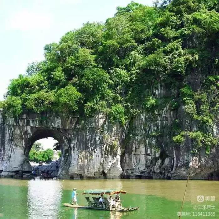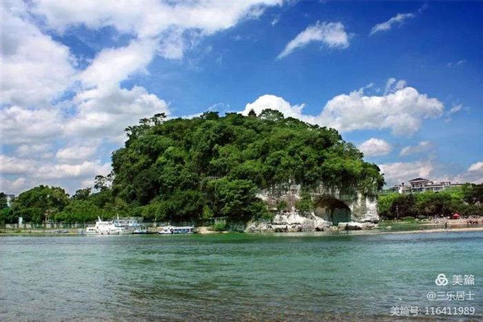 景区中最大的亮点是江山水月,它是观赏象鼻山的最佳之处。象鼻山又称象山,是因为山的形状酷似一只站在漓江边,伸长鼻子畅饮江水的大象而得名。桂林的名山数不胜数,为什么独选象鼻山作为城徽呢?我想是“象”与“祥”同音,有吉祥如意的寓意。再加上象鼻山的山顶上建有宝瓶状的普贤塔,大象驮宝瓶构成了一幅太平有象图,象征着和平、美好、幸福、吉祥。所以说桂林人还是很有眼光的。