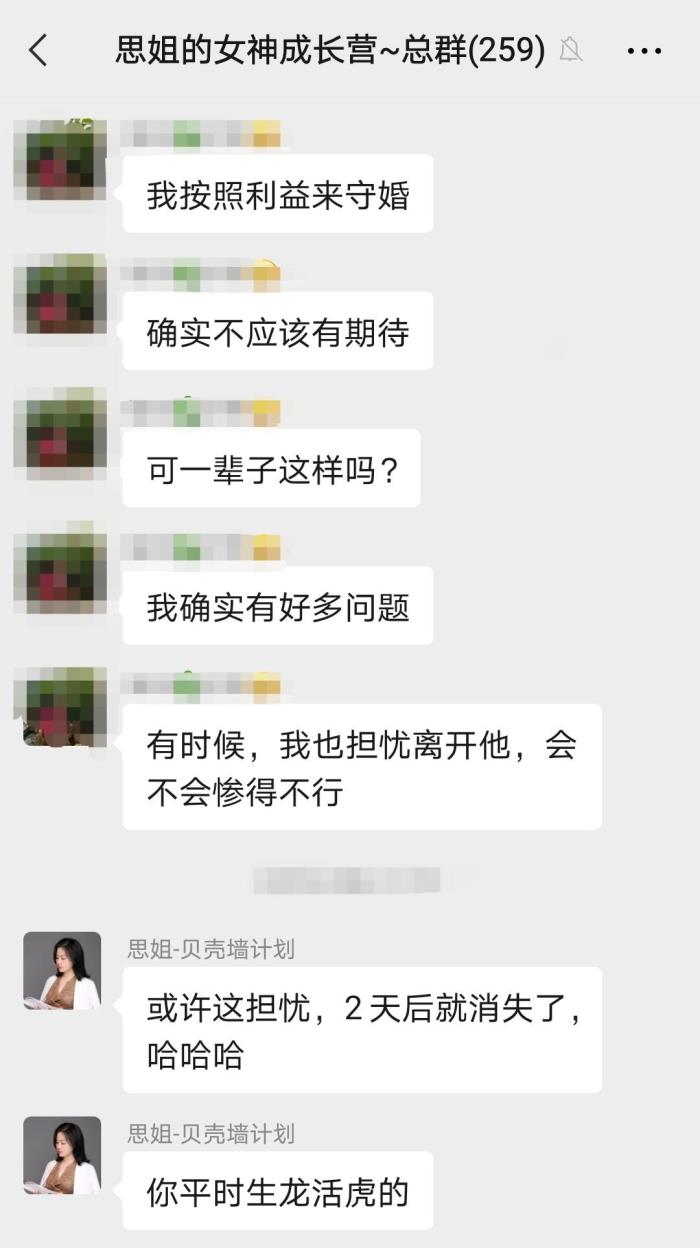 像我们群内遭遇出轨的姐妹们,在认清现实之后,果断收回情感,开始把希望寄托在自己身上。她们闷着头地搞事业,每天讨论的话题就是如何搞钱,研究怎么创业。要么就是怎么变美,怎么让自己更优秀。