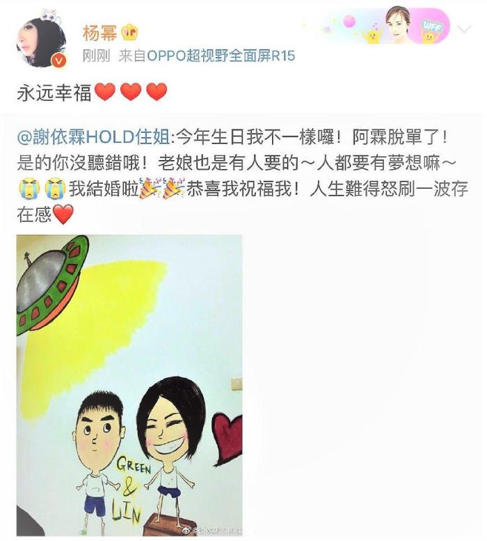 深受观众喜爱的喜剧明星谢依霖今天宣布了自己结婚的好消息,男方英文名叫green,但没有公布对方的长相,以漫画照代替!杨幂、陈学冬、阚清子等圈中好友纷纷送上祝福,连谢依霖自己都调侃,难得人生刷一回存在感。虽然一直在娱乐圈甘当绿叶的角色,但回顾谢依霖的星路其实非常坦荡,凭借hold住姐的天才表演一夜成名,又遇上《小时代》这样的好电影,想不红都难。