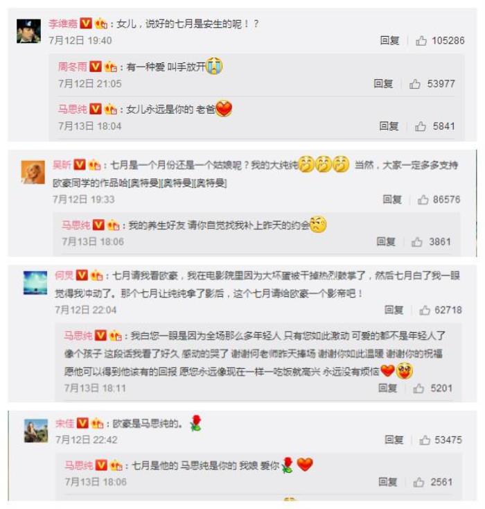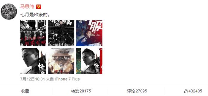 她12傍晚,她突然在微博上PO出几张欧豪电影的宣传图,配文“七月是欧豪的”。