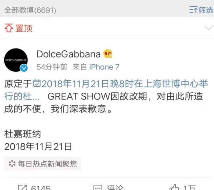11月21日16时48分,杜嘉班纳通过官方微博发布消息,宣布今晚8点在上海世博中心举办的品牌秀因故改期。