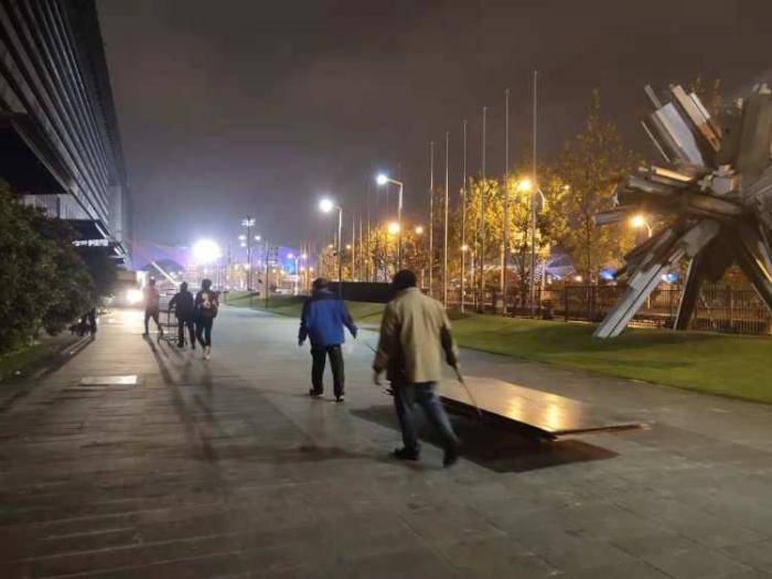 记者随后又赶往上海世博中心,看到此时空旷的正门广场前已经看不到人,嘉宾注册点的牌子冷清得立在一旁,不远处还放着一些拆卸下来的灯具。