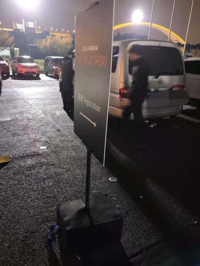 各个出入口都站着几名安保人员,另一个侧门门口还立着杜嘉班纳品牌秀签到处的牌子,但进进出出的不是模特和嘉宾,而是正在撤离各种工作道具器材的工作人员。