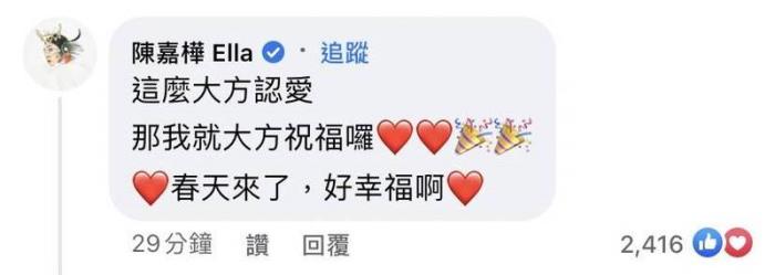 看好友Ella对她的祝福就知道了,“这么大方认爱,那我就大方祝福啰,春天来了,好幸福啊”,短短16字尽显其喜悦之情,网友也纷纷猜测,Ella作为闺蜜,早就知道Selina沐浴爱河。