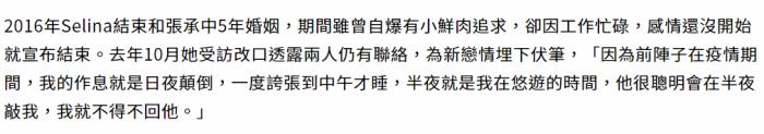 与Selina在2016年结束5年婚姻的张承中,也公开送上祝福,他表示Selina曾介绍新男友给他认识,台媒估计,Selina的前夫与新欢相处得还不错。