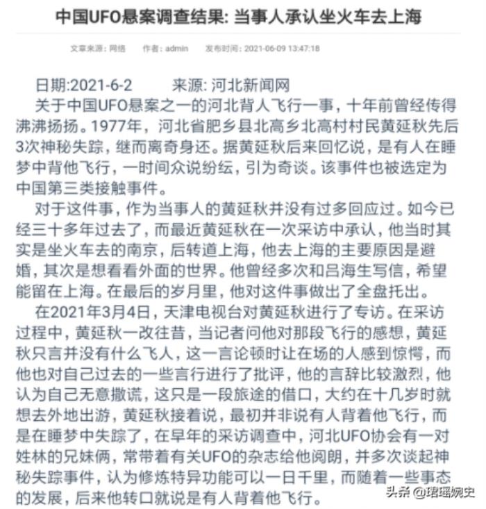 其实黄延秋年轻的时候就想出去旅游,但家里贫困自然不想给他旅游的钱。于是他就偷偷登上火车去了别的地方。回来后因为没法交代,就编了这么一个故事。黄延秋没啥学问,自然不会编的完美无缺,随着事件发酵后,就有人刻意引导他说是“外星人”,怎么玄乎怎么来。