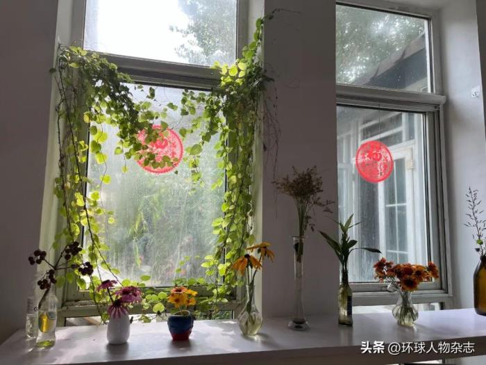 ·阳光透过窗户照射进来,白色桌子上摆着柳文做的插花。刘舒扬/摄