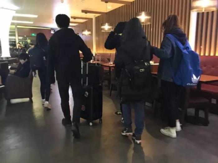 一姐一下飞机就被跟拍,有两个女生一左一右揽着她走。