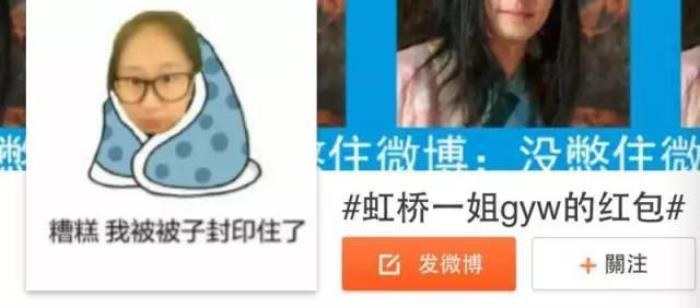 12月29日,微博上有ID发起了话题#虹桥一姐gyw的红包#,再度掀起一轮浏览量21万的活动。领取红包的人会自动关注某彩票公司微博,为其涨粉。