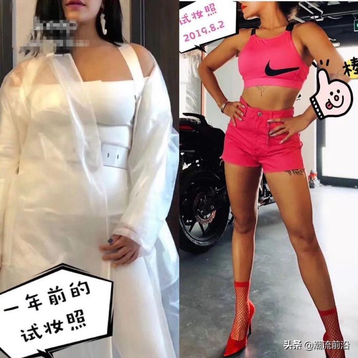 一年前的江映蓉真是让人有点接受不了呢,这看起来得有一百五十斤了吧,穿着很高级的白色连体裤,却穿出了地摊货的效果,再看一下瘦身成功的她,即使穿着玫红色的运动内衣,玫红色短裤,配上玫红色的渔网袜和同样玫红色的高跟鞋,这么具有挑战性的一身,穿在她身上只有性感好看呀,这腰部的马甲线若隐若现的,真是女神身材呀。