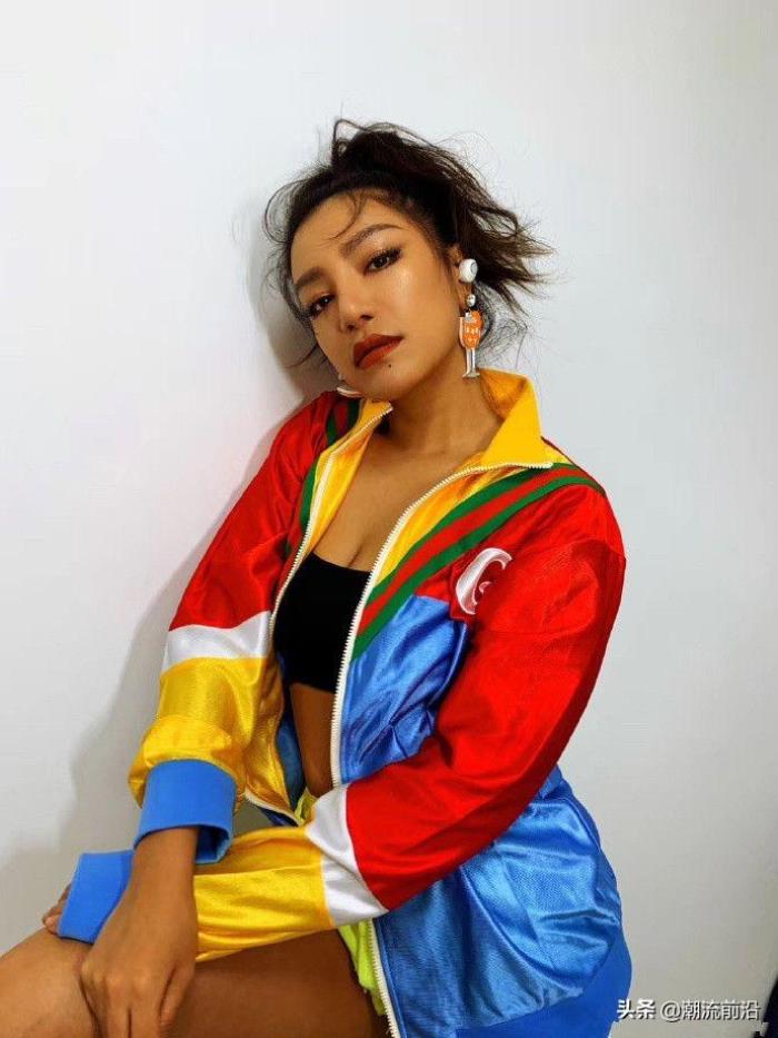 瘦身成功的江映蓉五官还是哪个五官,只不过脸小了一圈,五官立体了不少,看起来很高级,还是黑黑的皮肤,但是加上这一身一看就很健康很有力量的性感身材,整个变得一下子很有魅力,运动鞋女神,穿着黑色的抹胸,大秀性感好身材,穿这个一件很靓丽的彩色拼接运动外套,真是迷死人呢,这个类型的女明星真的很稀缺呢。