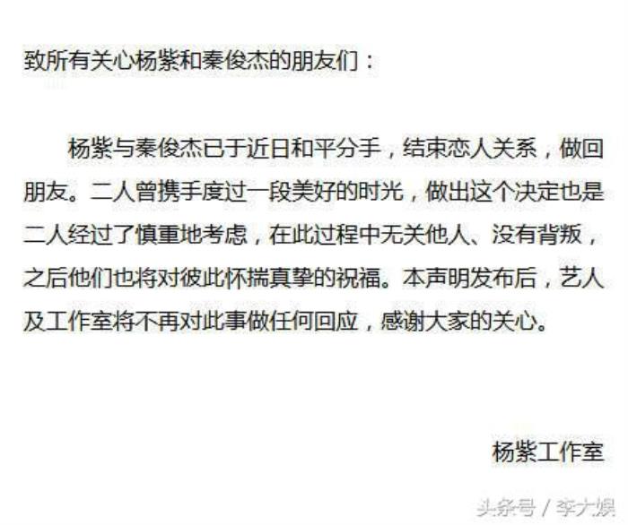 而在工作室的发文中写道:杨紫与秦俊杰已于近日和平分手,结束恋人关系,做回朋友。并且表示两人曾经有过一段非常美好的时光,做回朋友这个决定也是经过两人深思熟虑的考虑,与他人无关,在此过程中没有背叛。看过申明的网友也表示和马思纯欧豪的如出一辙。