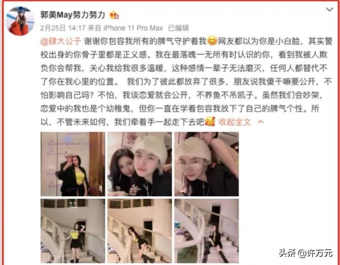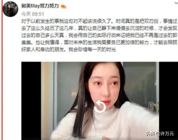 她还专门起了“郭美May努力努力”的新网名,这也算是从新开始的仪式,她还发文称:“对于以前发生的事,我这句对不起该说很久了…我会用自己的实际行动来证明我已经不再是过去的郭美美……”