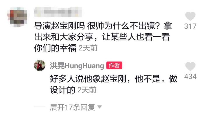 照片中的两人举止亲密,看起来格外恩爱。杨小平长相帅气,气质也十分文雅,这令众多网友纷纷评论:看起来还挺像导演赵宝刚。洪晃则回应说:他不是,是做设计的。
