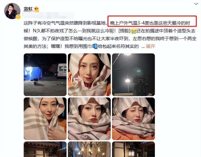 作为女演员的翁虹,当然也时常更新自己的拍戏日常。最近也时常在个人社交平台更新自己在影视基地拍摄的动态。画面中的翁虹头上披着围巾,看起来很是可爱呆萌。在文案中称自己这么做是为了保护造型不曝光,又要外出去做核酸。还称剧组气温骤降,看起来演员们拍戏也是很辛苦。