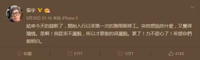 前几天,张宇突然发微博称自己将会无限期停工,很多网友表示累了就休息,我们会一直等你回来。