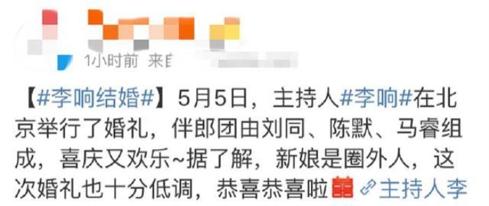 5月5日下午,有媒体报道称,主持人李响在北京举行婚礼,十分低调。消息一出,引发网友热议。