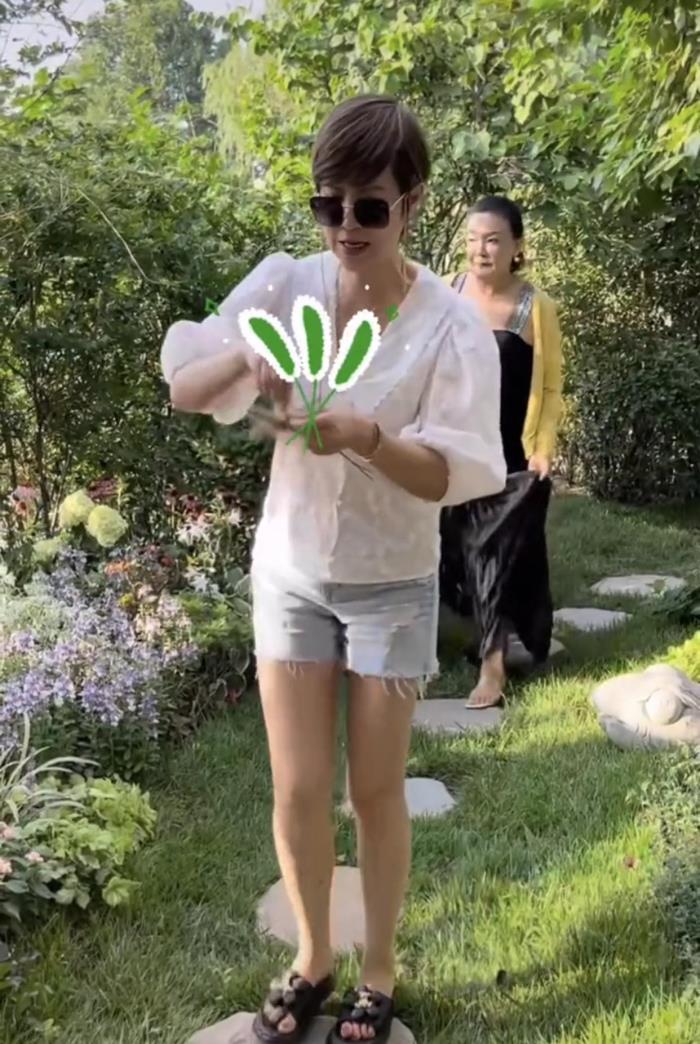 虽然室外天气炎热,但杭天琪还是很喜欢到院子里玩。她已是年近六旬之人,身材却还是保持得这么好,丝毫没有发福的痕迹,双腿也很纤细,看来杭天琪平时很喜欢运动。