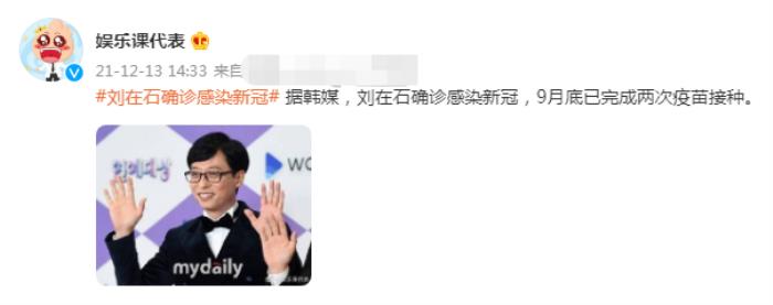 12月13日,据韩媒报道,韩国著名主持人刘在石确定感染肺炎,九月底已经完成两次疫苗接种,目前正在隔离。