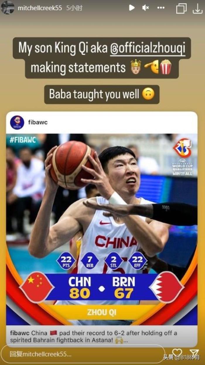 看到周琦在世预赛上的表现,周琦的墨尔本凤凰队的队长克里克更新了个人INS,转发了周琦22分7板2断的数据,并且配文写到:“我的好大儿国王琦证明了自己。爸爸教你教得太好了!”