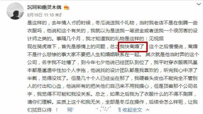 沉珂多年前隐匿于网络,在2015年再次回归网络,如今的她已经嫁为人妇,她的丈夫这个商人,她与现在的丈夫16岁的时候就认识,如今已经结婚生子,偶尔在网上晒生活照,一家三口也是非常的幸福,但是昨天沉珂在个人社交账号上发文称“快离婚了”,可以说是迅速的火遍了网络,一大早就上了热搜。