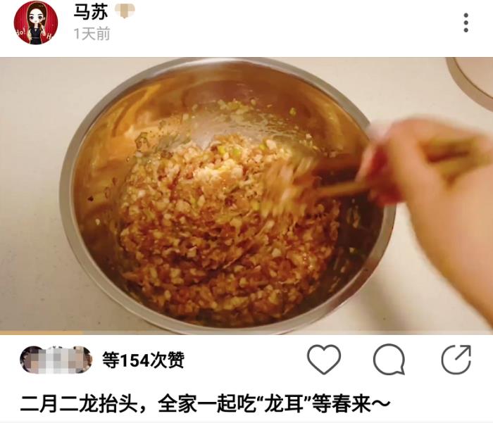 2月24号正好是中国传统意义上的“二月二龙抬头”,除了理发,这天吃的食物都会带上“龙”来取名字,马苏发文称“全家一起吃‘龙耳’等春来”,晒出她在家包饺子吃饺子的视频。