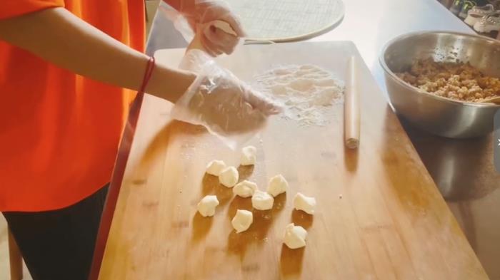 马苏将面团揉搓成条,然后再揪成一个个小团,做好准备。