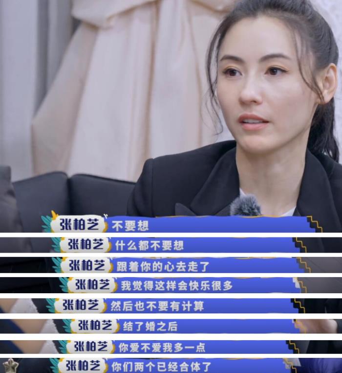 7月7日晚的综艺中,当被粉丝问及进入婚姻后是否应该做出相应的心态调整时,张柏芝很诚恳地说,希望对方什么都不要去想,一切都跟着自己的内心想法就会更容易快乐,结婚了也不要去总是芥蒂对方有没有更爱自己,要认识到婚姻是两个人的事情。