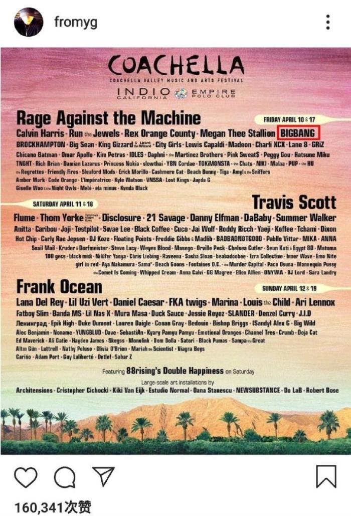 1月3日,著名音乐节COACHELLA的出演名单中出现了BIGBANG的名字。这也是权志龙服完兵役后,首次放出的团体回归消息。据悉,BIGBANG将于4月10日和4月17日两天在这个美国最大的音乐盛典。