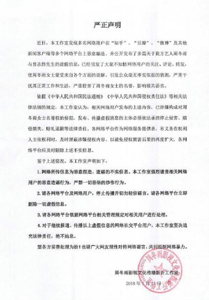 最近,曾志伟陷入蓝洁瑛侵犯案,在该事件持续发酵的时候,有网友在知乎发帖称周冬雨与曾志伟有关系,这种爆料没有来源,纯属造谣,对于这种恶劣行为,周冬雨工作室发布声明否认此传闻。