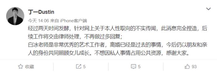而丁一则在个人社交平台发文说: