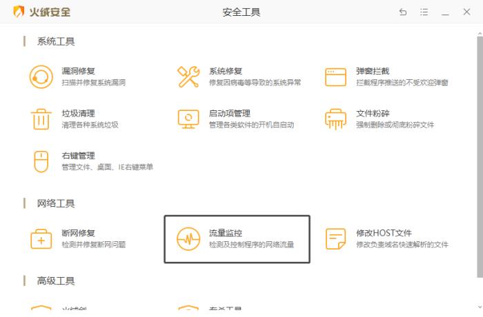 当然黑马这里不是让你去拔网线,毕竟咱们电脑中可不止一个输入法。首先我们找到电脑安装的安全软件,以黑马安装的火绒为例,在安全工具中找到流量监控: