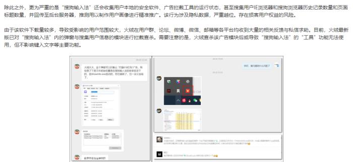 因为火绒官方还发现,【搜狗输入法】还会收集用户本地的安全软件和广告拦截工具的运行状态,甚至它还会收集用户浏览器的历史记录数量和页面标题数量从而进行精准的广告推送……所以别问为什么在手机上从来没有搜索过的东西,会突然有一天被推送到你的手机上。