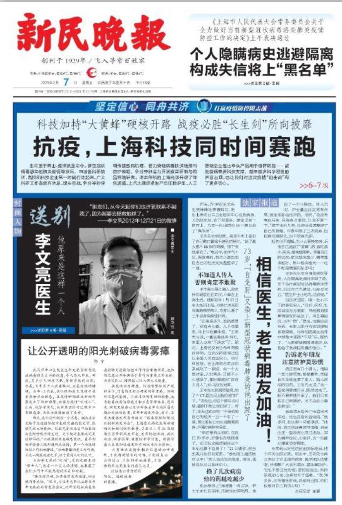 在上一篇文章中,我和大家分享过,绝大多数的都市晚报,都是午间截稿。而今天关于“国家监委决定赴武汉全面调查”这个消息,是2月7日中午一点过后,由中央纪委国家监委网站发布的。从这个意义上,我能明白午间截稿的《新民晚报》选择将李医生放在头版并配上评论,意味着什么。
