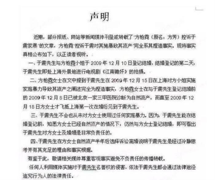 两人2009年12月结婚,2010年6月就离婚了,仅仅坚持了半年的时间,就分道扬镳了。但是离婚之后,方柏霓并没有就此罢手,还在社交平台上,谩骂于震,除此之外,还发了“被家暴”的照片。这时的于震陷入了“家暴男”的舆论中,他的经纪公司也站出来澄清此事,表示:方柏霓在结婚之前,就已经流产了,也从来没有使用过“家暴”,两人是公有公有理,婆说婆有理。