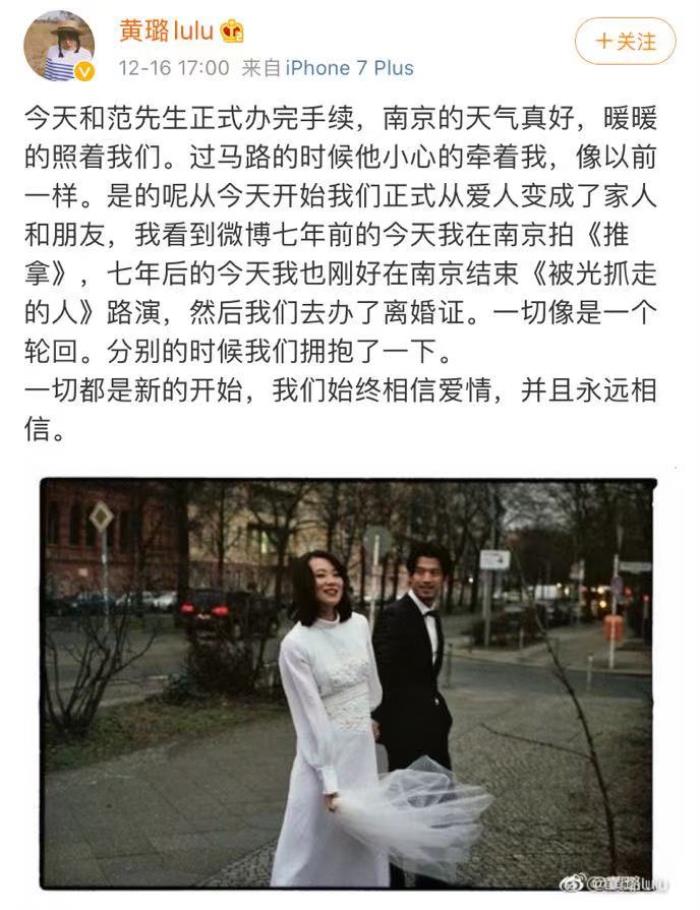 黄璐知名度比前任范玮要大一点,关于离婚,黄璐轻描淡写,描写得很美,这样体面的分手不多见。因为范玮是南京人,所以他们在南京办理离婚手续,相同的是七年前黄璐在这里拍摄《推拿》,七年后为主演电影《被光抓走的人》的路演活动,看来他们还是无法逃离七年之痒。有人认为他们可能是为电影炒作,实则谁也不会拿这么大的事开玩笑,除非是张亮。