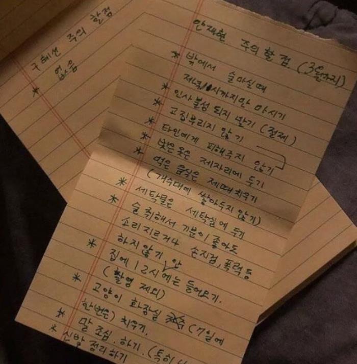 在外面喝酒只能喝到10点;不能喝到不省人事;不能任性耍脾气;不能给他人带来损害;脱掉的衣服放到原位置;吃剩的食物及时处理;需要洗的衣服要放到洗衣室;喝醉酒即使心情不好也不要大喊,禁止动粗使用暴力;12点之前回家(除了拍摄需要外);一周清理一次猫猫的厕所;背地里不要说别人的闲话;整理鞋子。