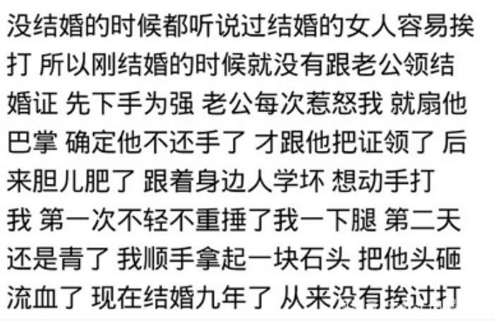 @小A:我的同事50多岁了,老公对她可好了。年轻的同事讨要诀窍。她说结婚后的第一天早晨,婆婆,老公,小姑子因为她没早起给全家人做早饭,吵起来。老公举手就打,拳头还没落在身上,就让她一铁锨拍在后背上,摔在活煤的池子里。从此一家人就和和美美的过上了日子。