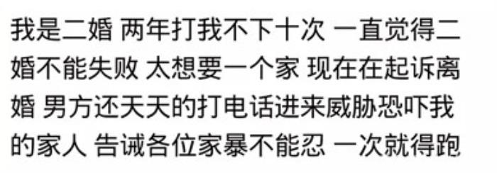 @小B:第一次家暴就不能容忍,否则,吃亏的永远是女人。我老公第一次动手时,我二话不说,去厨房拿两菜刀就砍,他跑进卧室,我顺手扔过一把菜刀去,砍在门框上,他在里面打电话给我道歉,不敢出来,我提着另一把菜刀堵在门口。仅此一回,结婚十几年了,再没动过手。