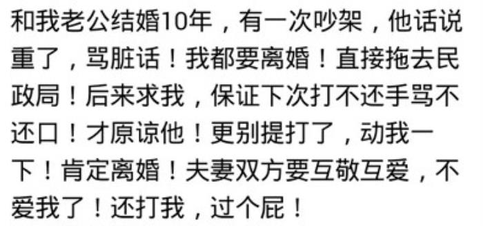 @小C:结婚第二天老公在他亲戚面前凶我想给我个下马威,没一个人帮我说话,我提包走人,给他撂下一句话,明天过来离婚,然后婆婆和他舅妈都来劝我,哎呀,这就离婚多丢人啊,吧啦吧啦一大堆,现在对我比结婚前好,多少男人以为结了婚女人就跟定他了,幼稚