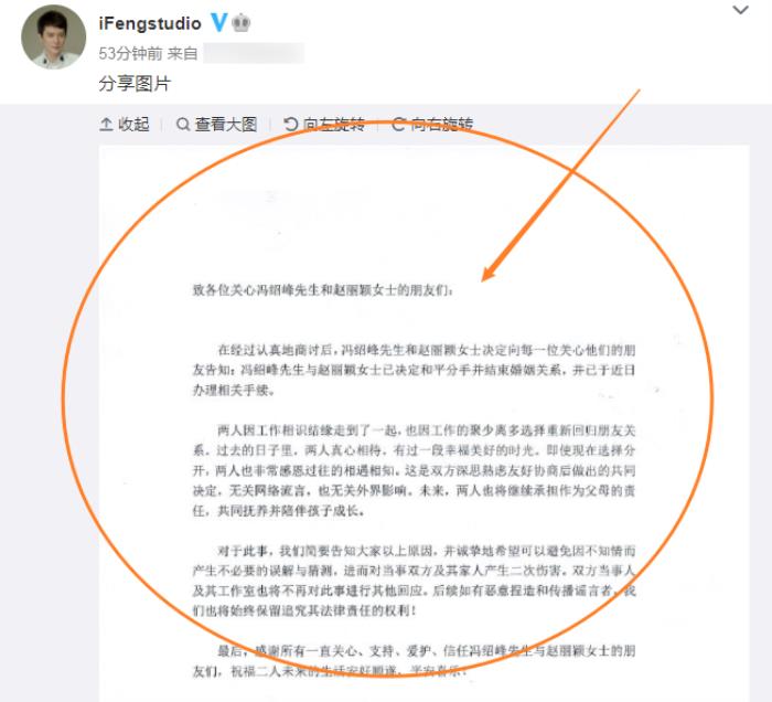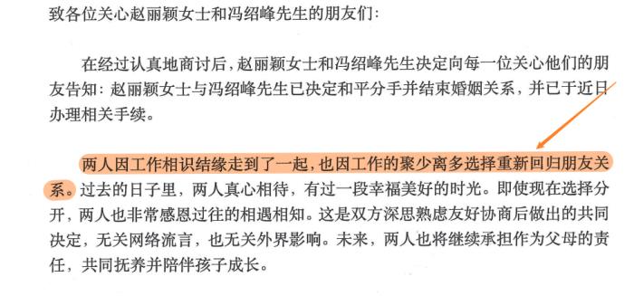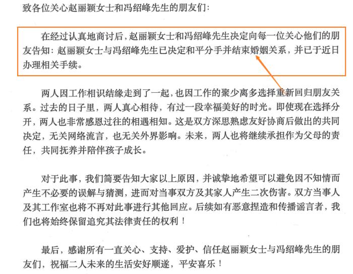 可以看到赵丽颖的工作室毫无征兆的发出了一则声明,在这则声明的第一段话,就交代了赵丽颖和冯绍峰目前的感情现状,能从中了解到赵丽颖和冯绍峰已经决定分手并且结束婚姻关系,并且相关的手续已经办理好,至于孩子的问题,赵丽颖和冯绍峰也依旧会继续承担父母的责任。