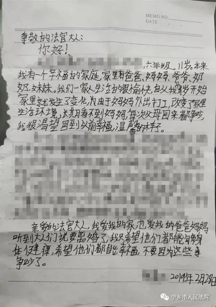 “亲爱的法官大人,我爱我的家,也爱我的爸爸妈妈,听到大人们说要离婚,我只希望他们能够身体健康,希望他们都能幸福,不要因为这些事争吵了······”