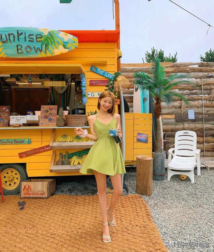想展现直角肩,奇异果色挂脖连衣裙一定要来一条,清爽又不张扬,就是“绿茶”本茶~