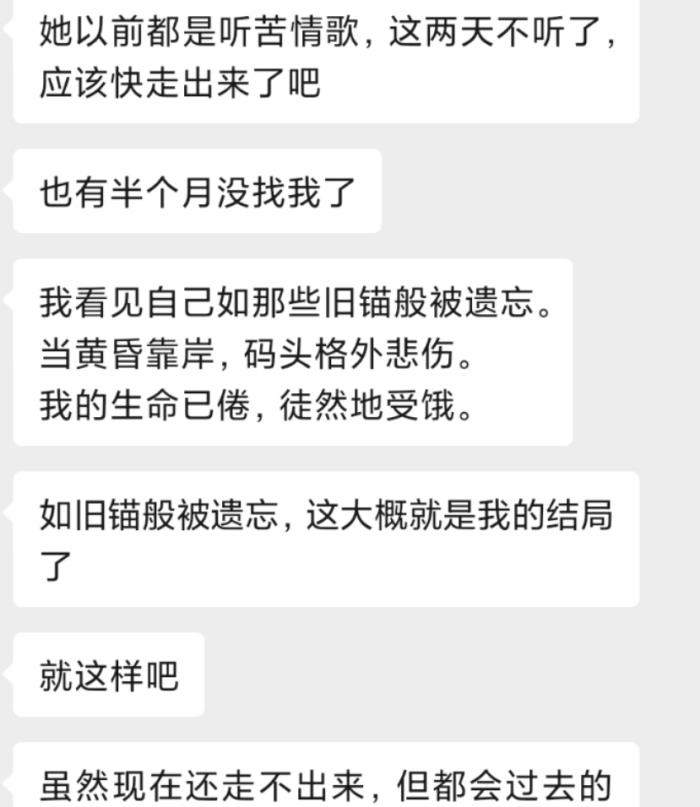 做完了这一切后,他又自己暗中观察前女友,在能推测出来的各种信息中煎熬痛苦,走不出来。
