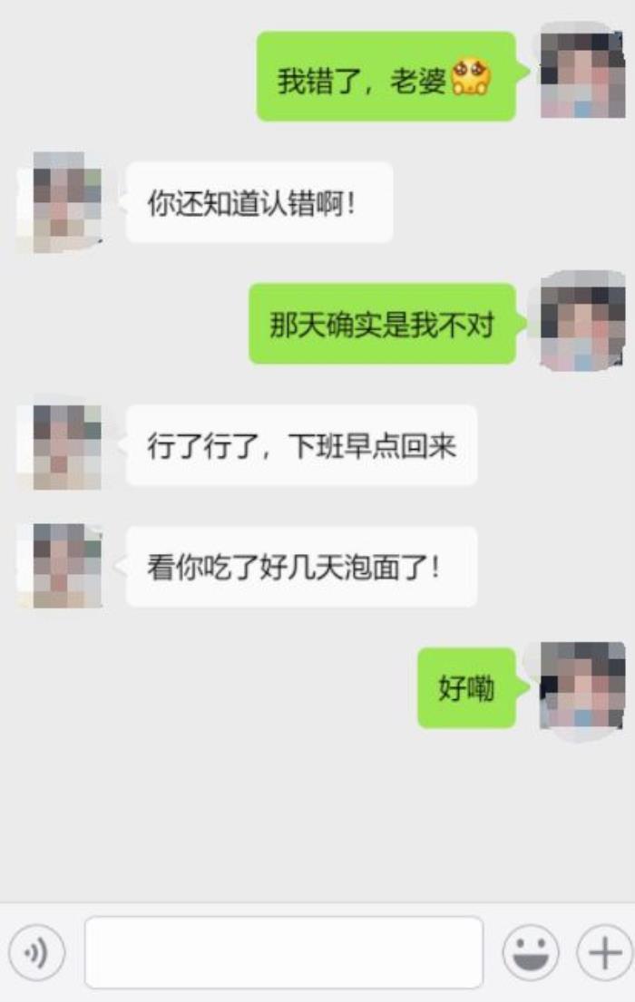 工作中的挫折,领导的责骂,朋友的不支持,种种问题的积累总会让一个人压抑,但现代人却十分缺少发泄的手段。因此,跟亲近的人吵架则成为了许多年轻人发泄最常用的方法。可能他们自己没有意识到,但在无形中因为一些小事,对亲人大发雷霆,将内心所有的不满宣泄在一个人身上,显然是十分不妥的!上图中的小伙,显然是因为某些小事将生活中的不满一下子就发泄在了妻子身上,好在事后自己意识到了错误,主动承认了错误!不过,老婆的回复可以说是“爱意满满啦” 一句早点回家吃饭,不仅表达了对老公吃了几天泡面的心疼,还蕴含着“跟我吵架就没饭吃的意思吧”
