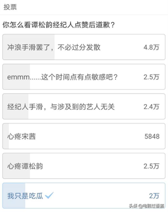 点赞事情发生后,有人发起了投票,结果投“心疼宋茜”的人远远少于投“心疼谭松韵”的人,可见宋茜要穿上金鹰女神的战袍,估计得褪一层皮。